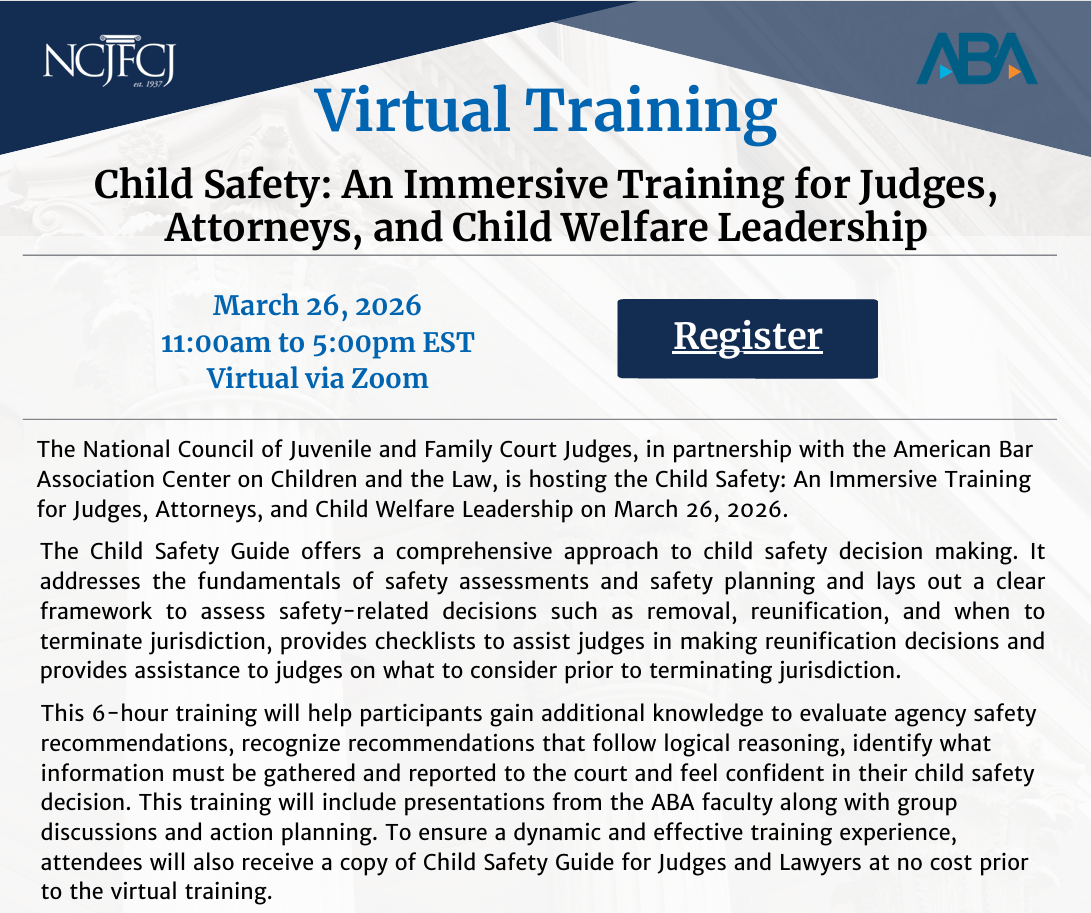 The National Council of Juvenile and Family Court Judges, in partnership with the American Bar Association Center on Children and the Law, is hosting the Child Safety: An Immersive Training for Judges, Attorneys, and Child Welfare Leadership on March 26th, 2026, from 11am-5pm EST.