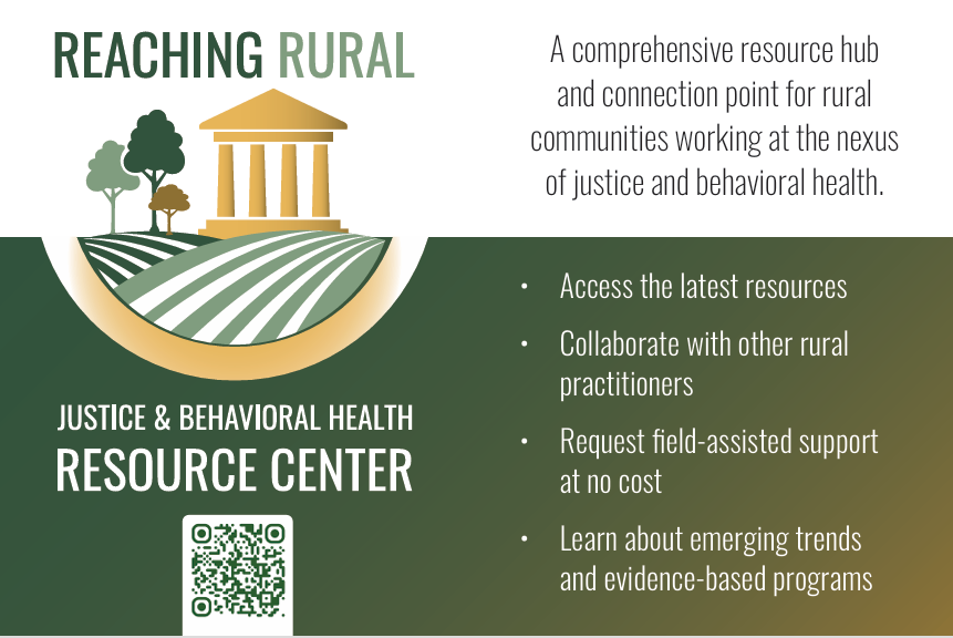The Institute for Intergovernmental Research, in partnership with the State Justice Institute, created the Reaching Rural Resource Center: Justice and Behavioral Health. This site serves as a comprehensive resource hub and connection point to share timely publications, complementary websites, webinars and other virtual leaning opportunities, and solution-oriented guidance specifically focusing on rural communities at the nexus of justice, behavioral health, and substance use disorder (SUD).